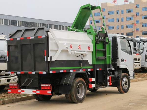 該車箱體有效容積:5立方,箱體前部側(cè)面帶有掛桶提升機(jī)構(gòu),可自動舉升垃圾桶倒入垃圾,帶自卸功能,尾部裝有橡膠密封條,防污水滴漏,杜絕二次污染。掛桶垃圾車可根據(jù)客戶要求搭配120升或240升塑料桶和鐵桶。