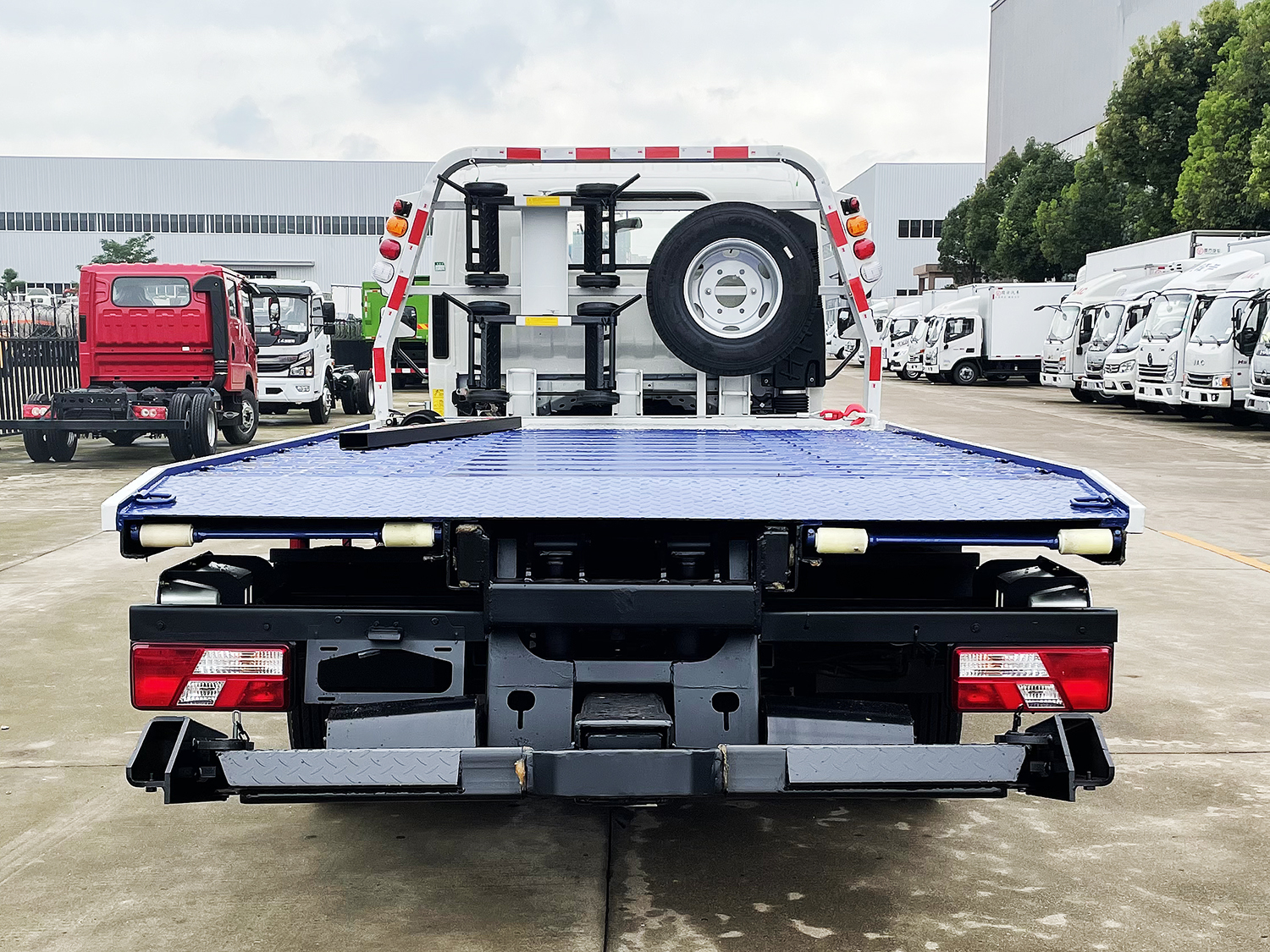 藍(lán)牌上裝配置:沖壓式伸縮板,液壓翻轉(zhuǎn)常規(guī)托舉裝置,平板可承載4噸以內(nèi)重物,主板長(zhǎng)4~4.2米,折疊、伸縮或翻轉(zhuǎn)部分1~1.35米,平板總長(zhǎng)可達(dá)5.1~5.35米,雙側(cè)聯(lián)動(dòng)操作裝置,后工作燈三只,1個(gè)40KN液壓絞盤(pán)(25米鋼絲繩)一個(gè)工具箱一個(gè)洗手箱,配兩個(gè)**小車(chē),四根新式綁帶,鏈鉤1條,L型抱胎架一對(duì),托叉和托叉座各一對(duì),帶2噸后托臂。